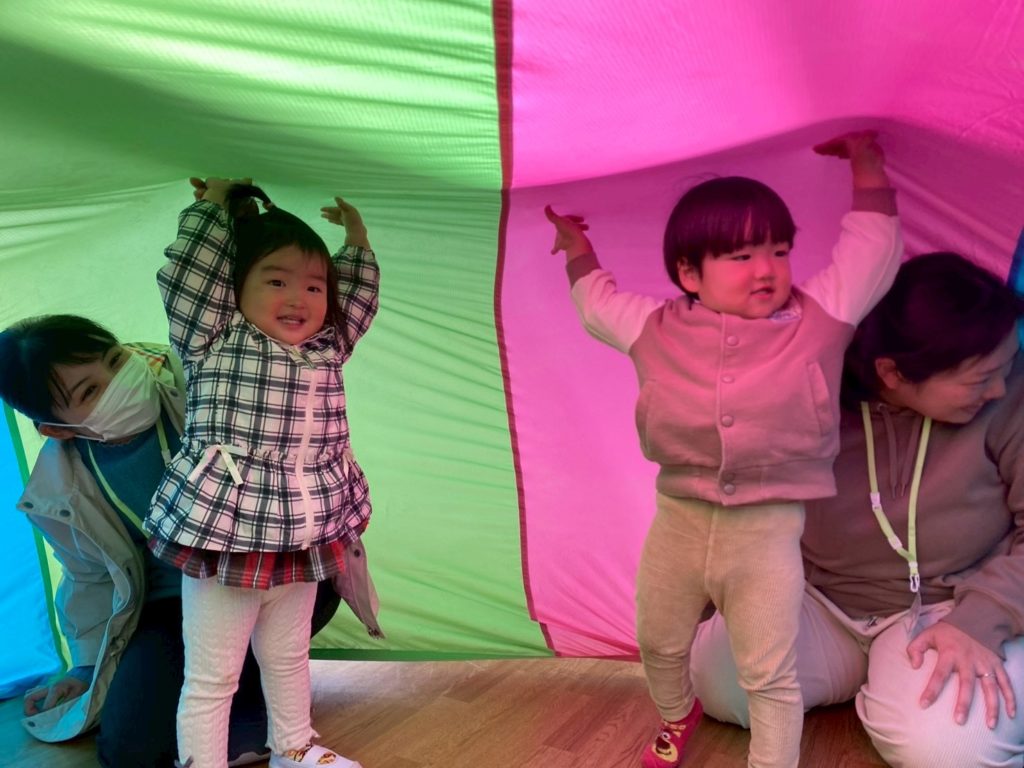 みんなでお家を作ったりバルーンの上を歩いてみたり、優しいお兄さんお姉さんが一緒に遊んでくれてお友達も楽しそうな様子でした😊