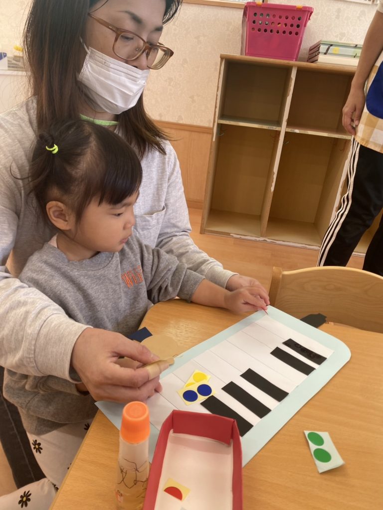 鍵盤にドレミのシールを貼ってもらおうと思ったのですが、子どもたちは思い思いの場所にシールを貼っていました🤣